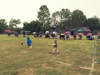 I laugh at this picture of Hayden & Calvin playing soccer in their rain coats while James actually played a game soaking wet. I know now, light rain means game on!