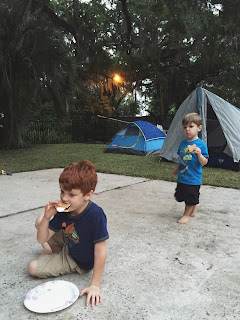 The best part of the set up was when Calvin disappeared for a minute, and then came outside WITH THE PLAY TENT FROM HIS BEDROOM. haha, I'm so glad he didn't fall down the stairs trying to carry it, or break anything hanging on the walls. Gosh, but it was hilarious to see it set up next to the other tents outside.